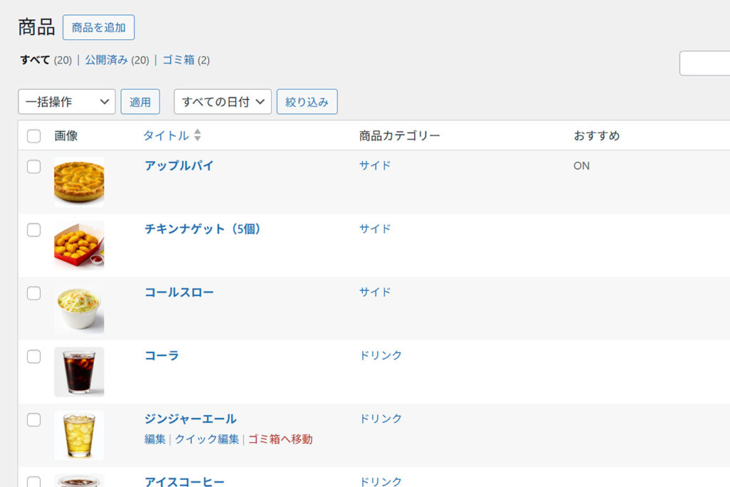 画像列にはアイキャッチ画像のサムネイルが表示され、おすすめ列にはおすすめされる商品が「ON」と表示されます。